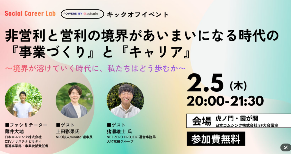 日本コムシンク株式会社様が運営する、ソーシャルキャリアコラボのイベントに運営事務局の猪瀬が登壇いたします。トークテーマは「非営利と営利の境界があいまいになる時代の『事業づくり』と『キャリア』」。